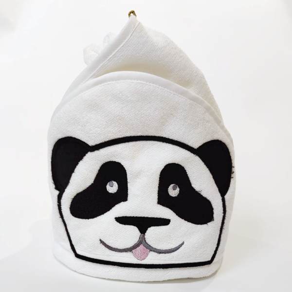 Dieses große bestickte Kapuzentuch misst 90 x 90cm und ist aufwändig bestickt mit einem Pandagesicht.