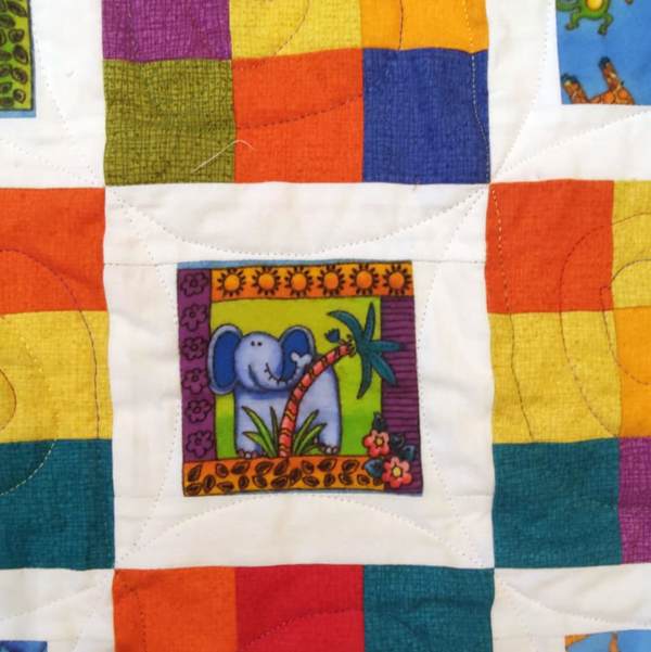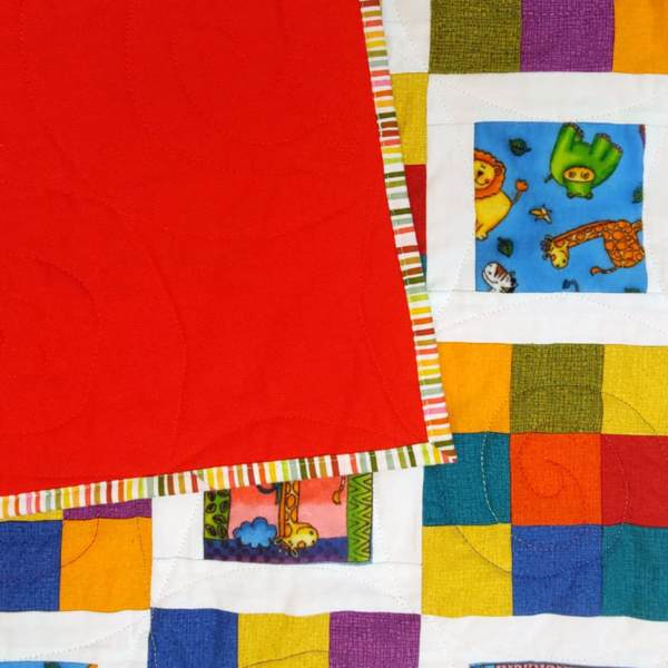 Alle Stoff sind 100% Baumwolle. Die bedruckte Quadrate zeigen verschiedenen Zootieren, dazwischen sind bunte 9-Patch-Elemente.