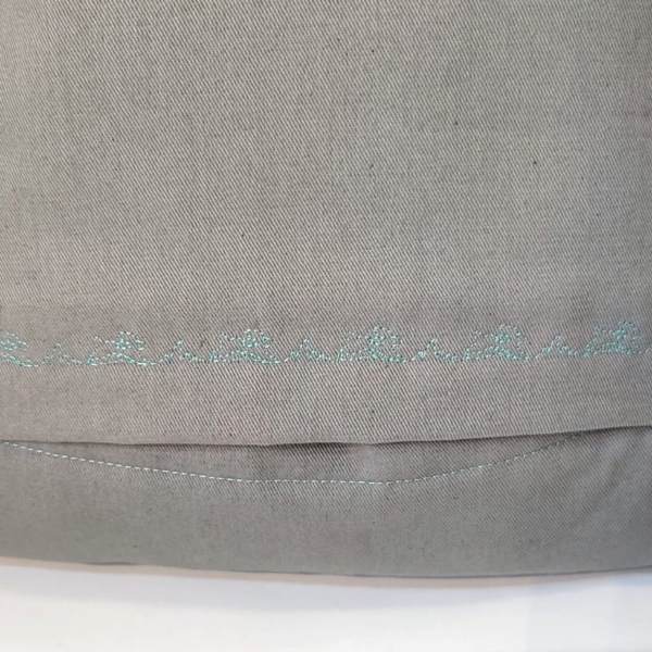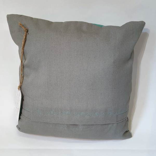 Das Kissen ‚To the Moon and Back‘ ist ein Patchwork. In der Mitte stehen zwei Hasen, andere Stoffe sind türkisgrün, weiß und grau. Stoffe sind aus Baumwolle.