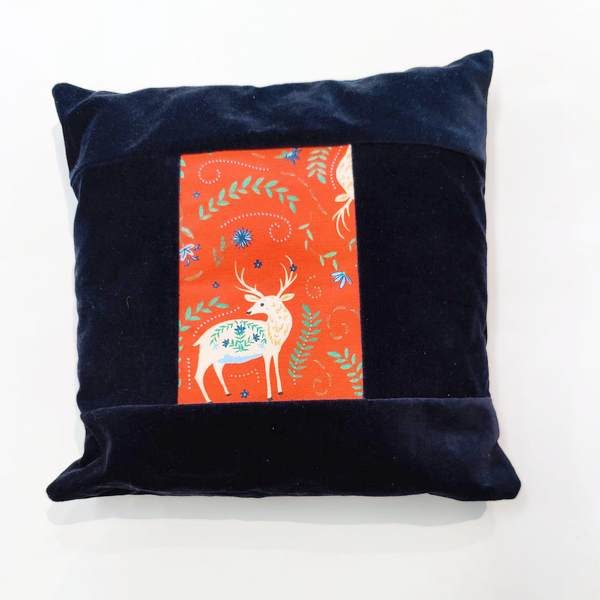 Das Reintier-Kissen ist ein Patchwork-Projekt mit Jersey und Samt. Alle Stoffe sind 100% Baumwolle. Das Kissen ist edel und bringt die Adventszeit in jedem Zimmer wo es hingelegt wird.