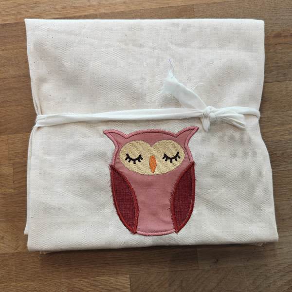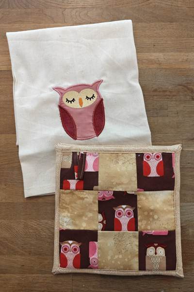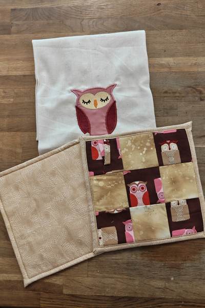 Das Geschenk-Set ist perfekt für jedes Zuhause. Das Geschirrtuch ist aus 100% Baumwollstoff und wurde mit einer Eulen-Stickerei veredelt. Die Topflappen in 9-Patch-Muster sind auch 100% Baumwolle, mit 2 Lagen Thermolan.