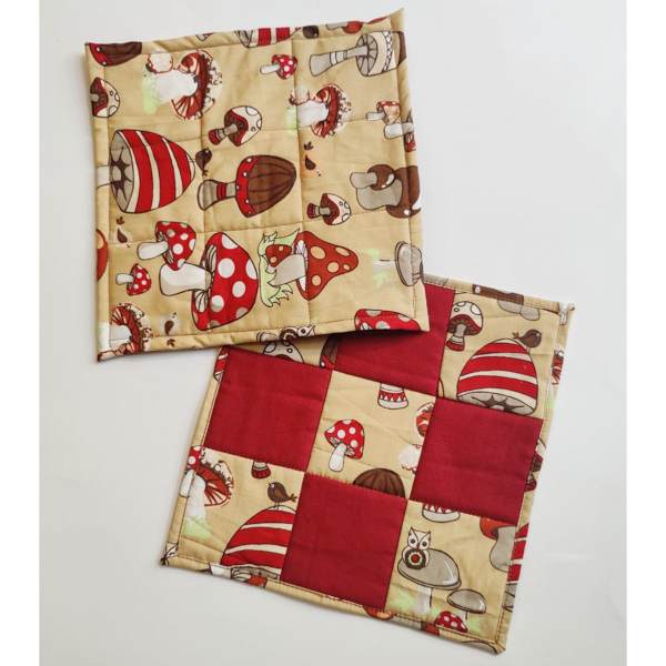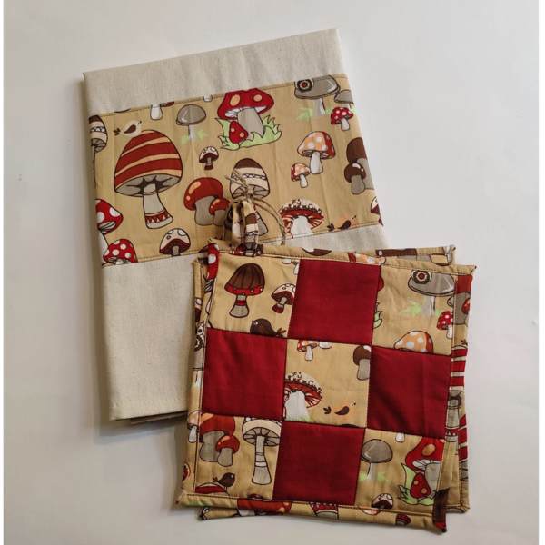 Das beige Geschirrtuch aus 100% Baumwollstoff wurde mit einem Pilz-Stoff in rot, weiß und beige veredelt. Aus dem gleichen Stoff gibt es zwei Patchwork-Topflappen. Die Topflappen sind mit zwei Schichten Thermolan genäht, so dass man sicher geschützt ist.