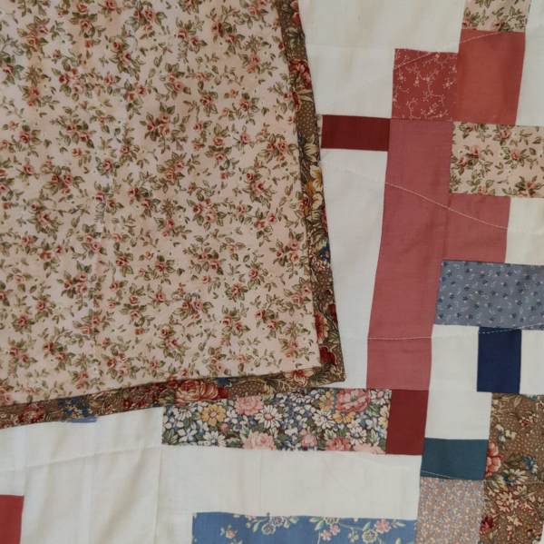 Die Rückseite ist ein Floral-Druck rosa/beige und die Decke würde in einem Floral-Druck eingefasst. Alle Stoffe sind 100% Baumwolle.