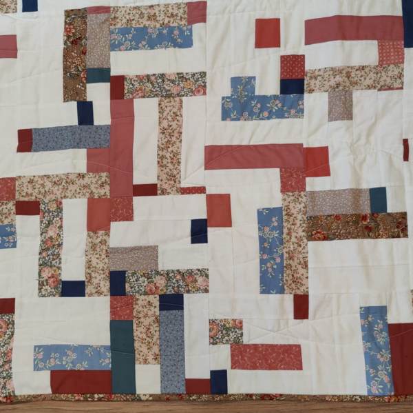 Die Mini-Meadow Patchworkdecke ist eine kleine Decke – 78 x 90 cm (30 x 35 Inch). Sie ist als Babydecke oder Schossdecke (Lap Quilt) gedacht. Alle Stoffe sind 100% Baumwolle und die Decke ist als Resteverwertung konzipiert. Die bunte Stoffen sind frei auf der weißen Fläche arrangiert.