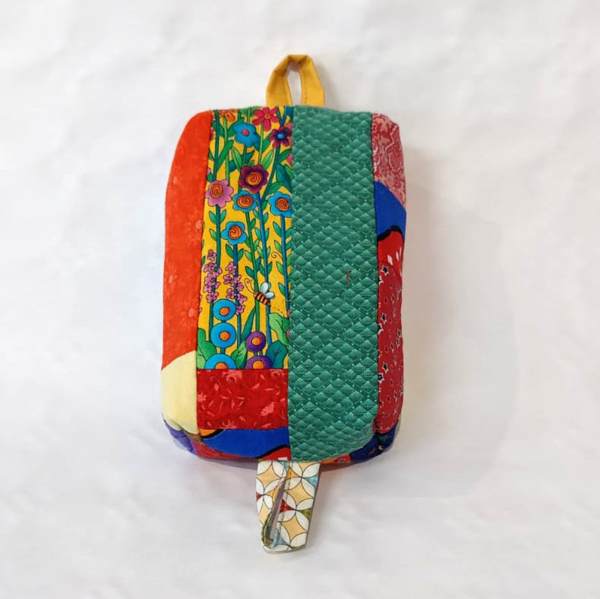 Das Boxy Bag türkis in Größe S aus bunten Baumwollstoffen ist der kleine Begleiter von Größe M. Außen schön bunt, die Tasche ist innen mit gelben Stoff gefüttert. Alle Stoffen sind 100% Baumwolle, Vlies aus Polyester.