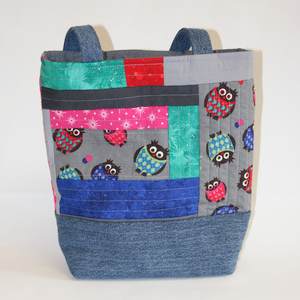 Diese bunte Patchwork-Tasche mit Eulen-Stoff wurde mit dem Quilt-as-You-Go Technik genäht. Der Boden und die Henkel sind aus festen Webstoff. Die Tasche ist gefuttert, hat eine Innentasche mit Reißverschluß und zwei Henkel aus dem gleichen Stoff wie der Taschenboden.