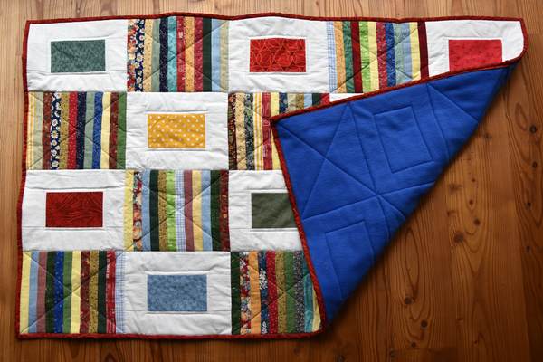 Das Innenvlies ist ein Baumwoll-Bambus-Mischgewebe. Die Decke ist mit einem einfachen Design gequiltet. Eingefasst wurde das ganze mit rotem Baumwollstoff. Die Decke misst 73 x 115 cm (29 x 45″). Sie ist groß genug für ein Babybett, aber auch klein genug für unterwegs im Buggy oder Auto.