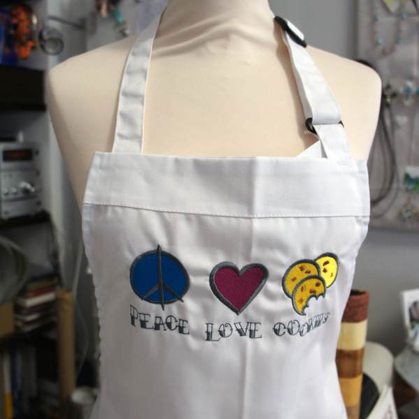 Diese Schürze ‚Peace – Love – Cookies‘ in weiß ist schön bestickt mit einem Design von Urban Threads.